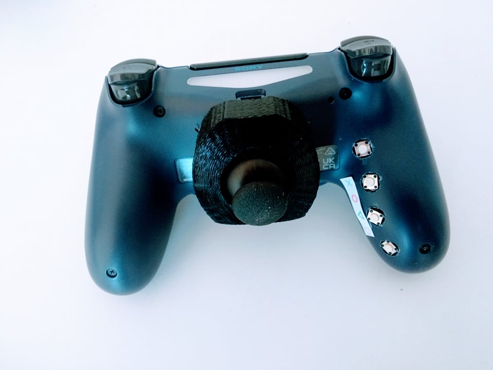 - Right joystick placed under the controller for use while resting on the knee